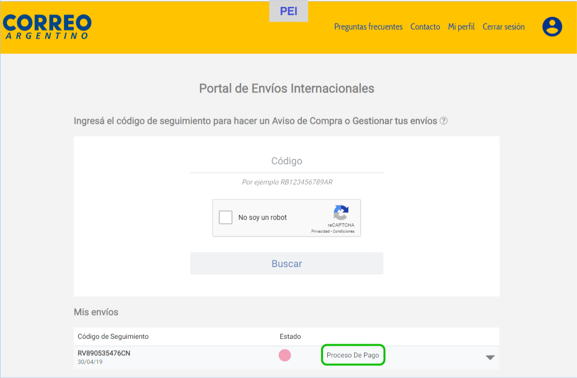 Una vez que el comerciante haya realizado el envío y nos haya proporcionado el código de seguimiento internacional (compuesto por dos letras, nueve dígitos y dos letras finales que indican el país de procedencia), ingresamos dicho número en la casilla destinada para ese fin y colocamos la tilde en la captcha «No soy un robot». Luego, hacemos clic en «Buscar». (Si no disponemos del código de seguimiento, esta acción la realizaremos una vez que recibamos el telegrama la notificación bajo puerta en papel).