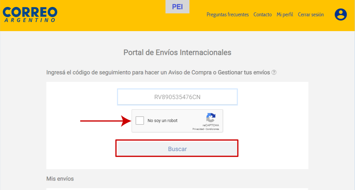 Una vez que el comerciante haya realizado el envío y nos haya proporcionado el código de seguimiento internacional (compuesto por dos letras, nueve dígitos y dos letras finales que indican el país de procedencia), ingresamos dicho número en la casilla destinada para ese fin y colocamos la tilde en la captcha «No soy un robot». Luego, hacemos clic en «Buscar». (Si no disponemos del código de seguimiento, esta acción la realizaremos una vez que recibamos el telegrama la notificación bajo puerta en papel).